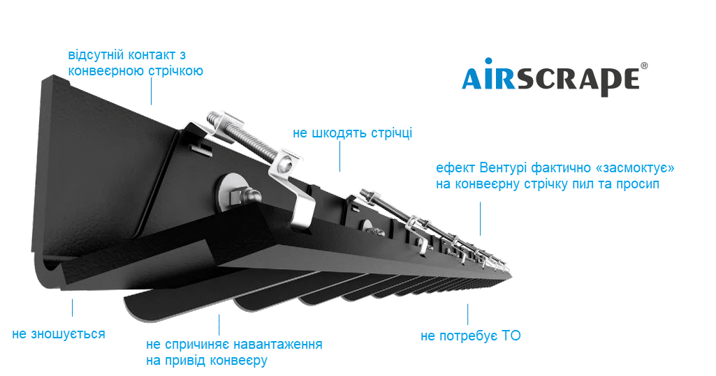 AirScrape® — це система ущільнення для стрічкових конвеєрів, яка була розроблена, запатентована та виготовлена в Німеччині відповідно до найвищих стандартів якості, безпеки та екологічності.